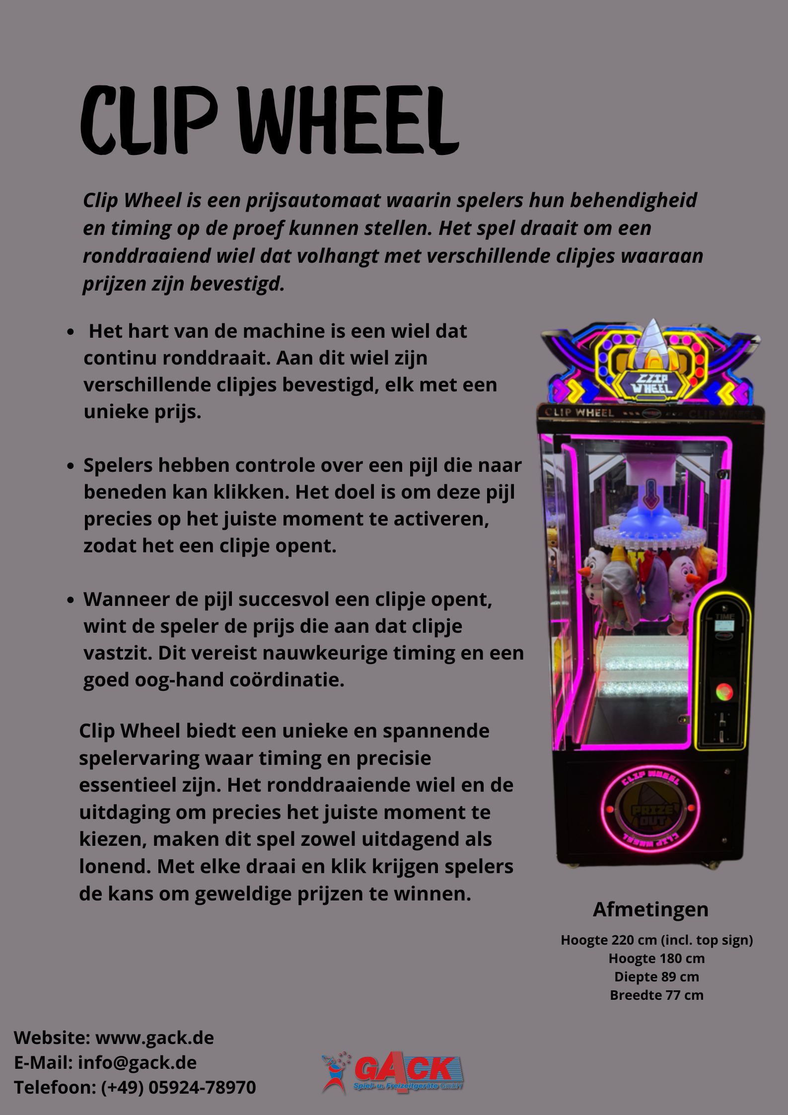 Description: Clip Wheel is an intriguing prize machine in which players can put their dexterity and timing to the test. The game revolves around a spinning wheel filled with various clips to which prizes are attached.